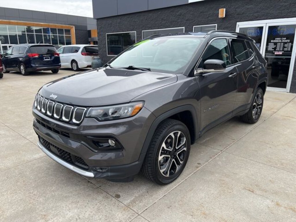 *NO NEED TO LEAVE YOUR HOME OR BUSINESS!! SZOTT DELIVERS!!!, *AWD*, *REMOTE STARTER*, *LEATHER SEATS*, Android Auto, Apple CarPlay. Recent Arrival! CARFAX One-Owner. Clean CARFAX. 2022 Granite Crystal Metallic Clearcoat Jeep Certified. 4WD Compass Limited 9-Speed 948TE Automatic With some available options like Quick Order Package 2GG, 10.1" Touchscreen Display, 3.73 Axle Ratio, 4-Wheel Disc Brakes, 6 Speakers, ABS brakes, Air Conditioning, Alloy wheels, AM/FM radio: SiriusXM, Anti-whiplash front head restraints, Auto High-beam Headlights, Auto-dimming Rear-View mirror, Automatic temperature control, Brake assist, Bumpers: body-color, Compass, Delay-off headlights, Disassociated Touchscreen Display, Driver door bin, Driver vanity mirror, Dual front impact airbags, Dual front side impact airbags, Electronic Stability Control, Emergency communication system: SiriusXM Guardian, Four wheel independent suspension, Front anti-roll bar, Front Bucket Seats, Front Center Armrest w/Storage, Front dual zone A/C, Front fog lights, Front License Plate Bracket, Front reading lights, Fully automatic headlights, Global Telematics Box Module (TBM), Gloss Black Exterior Mirrors, Heated door mirrors, Heated front seats, Heated steering wheel, Illuminated entry, Knee airbag, Leather Shift Knob, Leather Trimmed Bucket Seats, Low tire pressure warning, Occupant sensing airbag, Outside temperature display, Overhead airbag, Overhead console, Panic alarm, ParkView Rear Back-Up Camera, Passenger door bin, Passenger vanity mirror, Power door mirrors, Power driver seat, Power steering, Power windows, Radio: Uconnect 5 w/10.1" Display, Rain sensing wipers, Rear anti-roll bar, Rear seat center armrest, Rear window defroster, Rear window wiper, Remote keyless entry, Roof rack: rails only, Security system, Speed control, Split folding rear seat, Spoiler, Steering wheel mounted audio controls, Tachometer, Telescoping steering wheel, Tilt steering wheel, Traction control, Trip computer, Turn signal indicator mirrors, Variably intermittent wipers, and Wheels: 18" x 7" Painted Diamond Cut Aluminum.